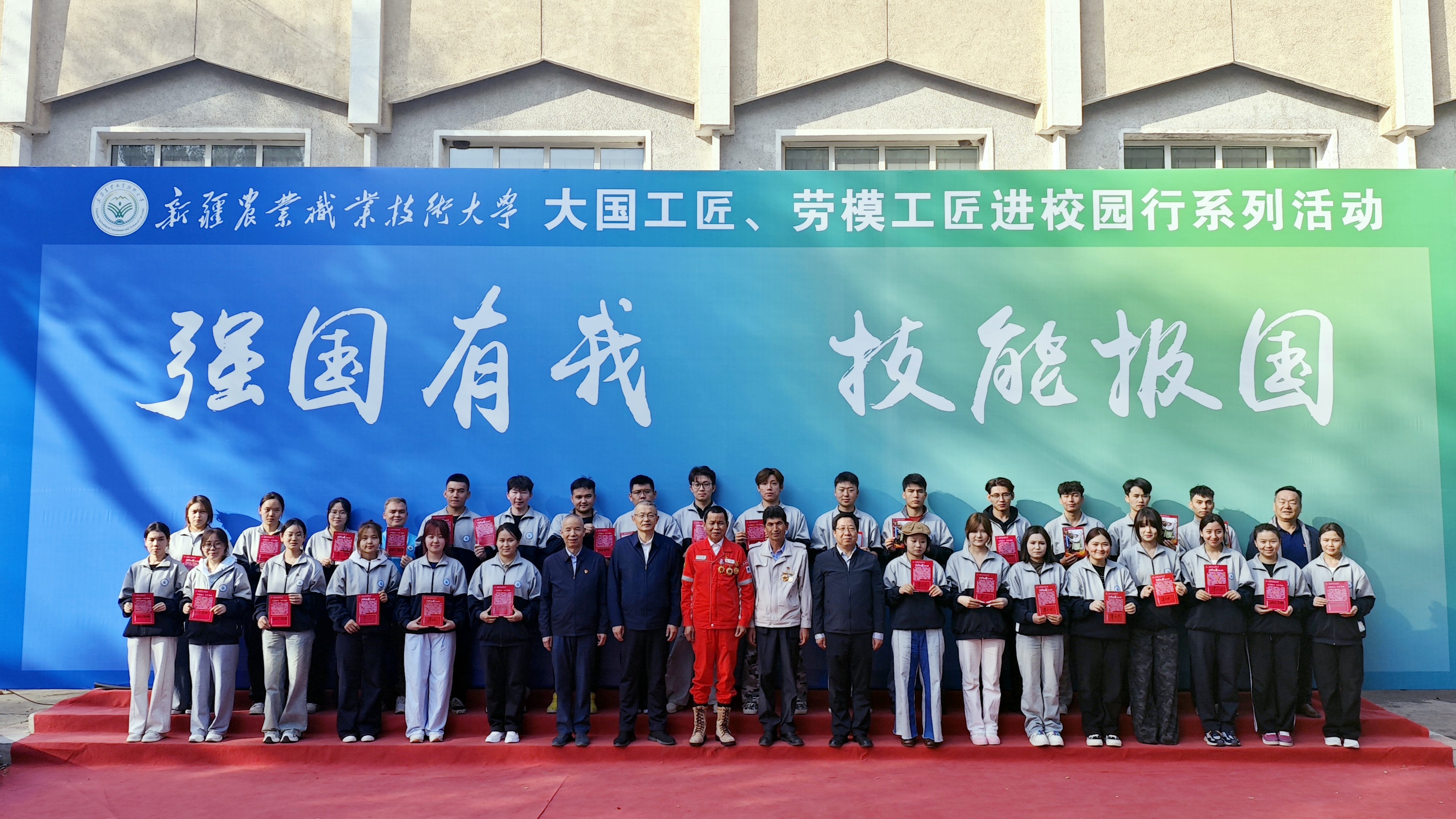 活动当天,校园内气氛热烈而浓厚。在以“匠心润桃李 劳模引航向 让奋斗力量点亮青春梦想”为主题的会场两侧,“自治区劳动模范”“全国五一劳动奖章”获得者、全国“最美职工”吾买尔・库尔班的海报格外醒目,其上“爱岗敬业 甘于奉献”的字样熠熠生辉。