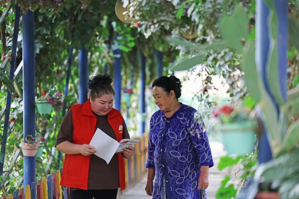9月18日,达西村村干部古力帕尔力·克衣木(右)入户询问村民生活情况。村民将