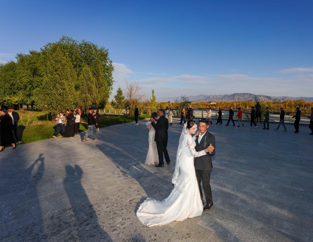 在特克斯河边的太极岛森林公园,新娘孔吐斯·也斯达吾列提与新郎布开汗·叶勒斯孜挽手走在一起(10月11日摄)。