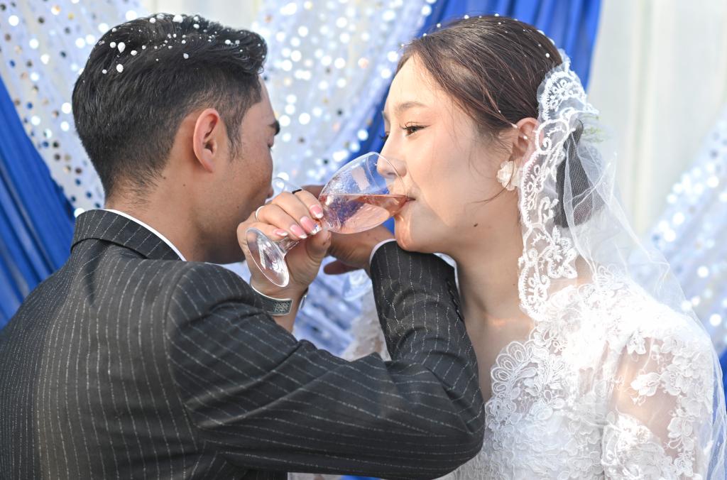 在特克斯河边的太极岛森林公园,新娘孔吐斯·也斯达吾列提与新郎布开汗·叶勒斯孜喝交杯酒(10月11日摄)。