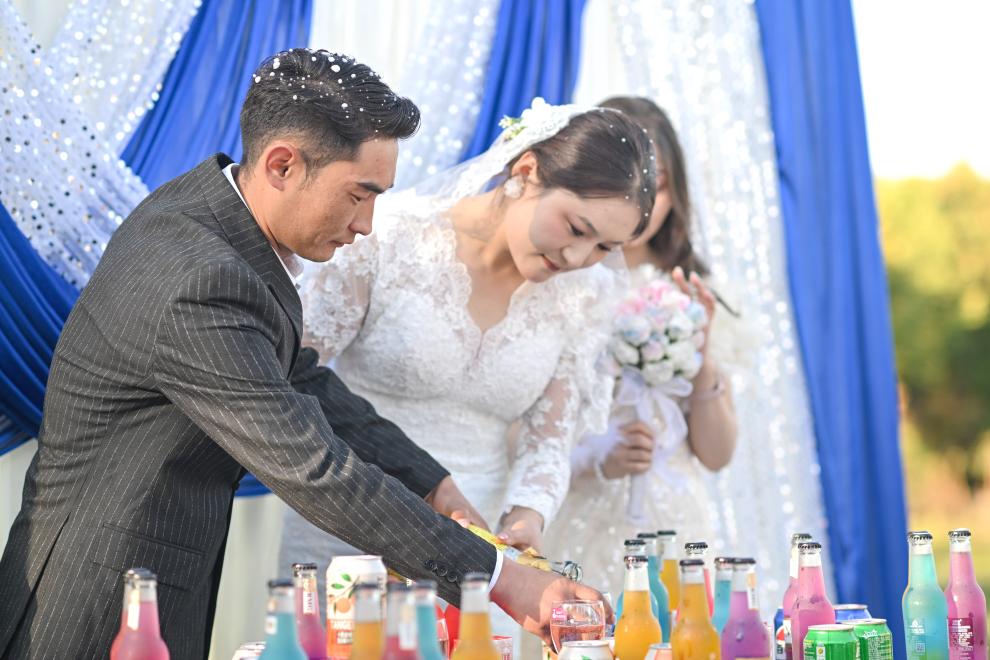 傍晚,在年轻亲友的簇拥下,这对新人在特克斯河边的太极岛森林公园举行户外婚礼仪式。孔吐斯换上白色婚纱,布开汗换上黑色西装。仪式上,孔吐斯和布开汗喝交杯酒、喷洒香槟、与亲朋好友共舞、互动游戏,热烈精彩的氛围吸引了不少游客围观。