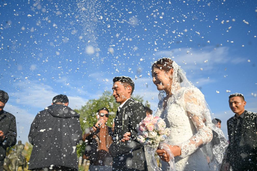 在特克斯河边的太极岛森林公园,新娘孔吐斯·也斯达吾列提与新郎布开汗·叶勒斯孜一起倒香槟(10月11日摄)。