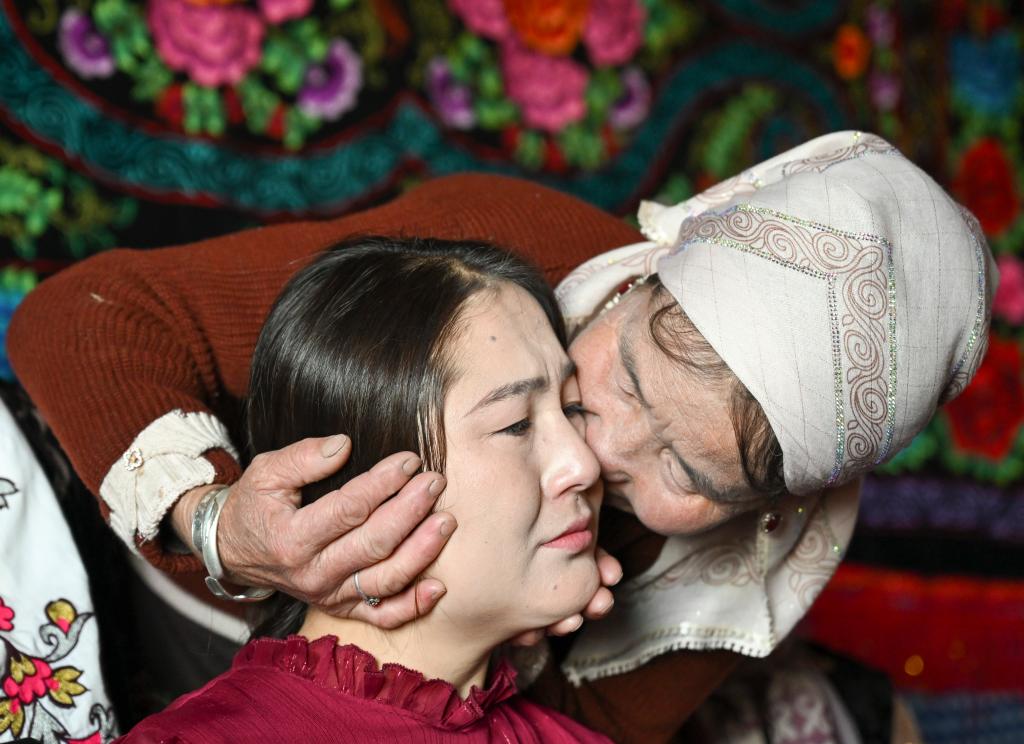 三伯母(右)亲吻孔吐斯·也斯达吾列提,送她出嫁(10月11日摄)。