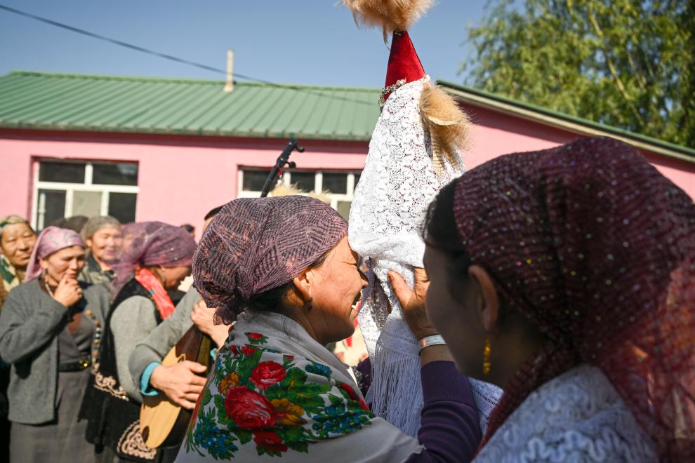 中午,车队抵达加尔阔拉村后,三位乐手弹奏着冬不拉、手风琴、吉他,边走边唱,将新娘迎至布开汗家中小院。民间艺人阿肯弹着冬不拉,带着新娘向男方父母及亲戚行礼,其间,有长辈揭开孔吐斯的面纱,送上祝福。随后,男方亲友协力将被子、家用电器等嫁妆搬进小院。