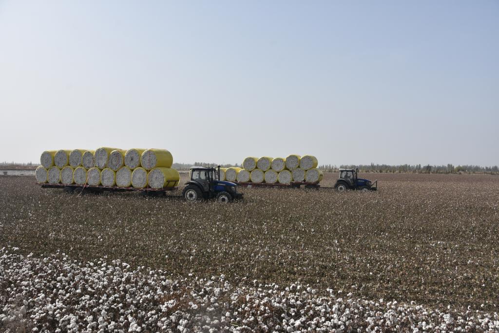 10月21日,在新疆阿克苏地区沙雅县,打包好的棉花被送往轧花厂。新华社记者 贺小童 摄