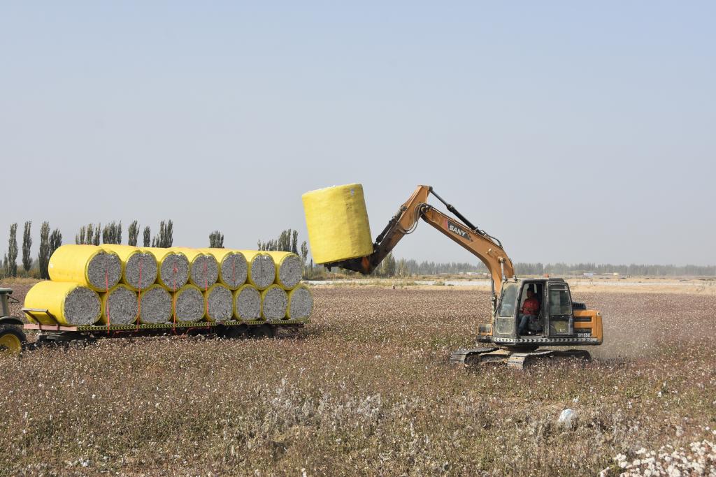 10月21日,在新疆阿克苏地区沙雅县的棉田中,叉车将打包好的棉花装车。新华社记者 顾煜 摄