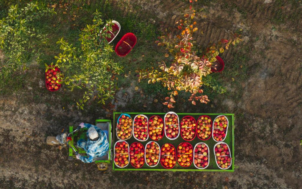10月23日,在新疆生产建设兵团第一师阿拉尔市六团三连苹果园,林果业服务队队员运输刚采摘的苹果(无人机照片)。