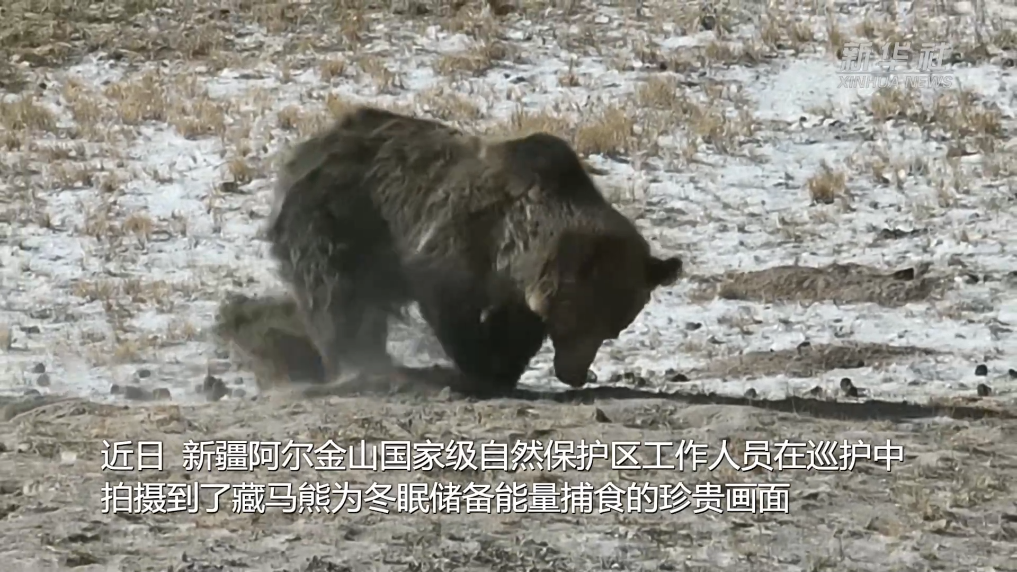 近日,新疆阿尔金山国家级自然保护区工作人员在巡护中,拍摄到了藏马熊为冬眠储备能量捕食的珍贵画面。