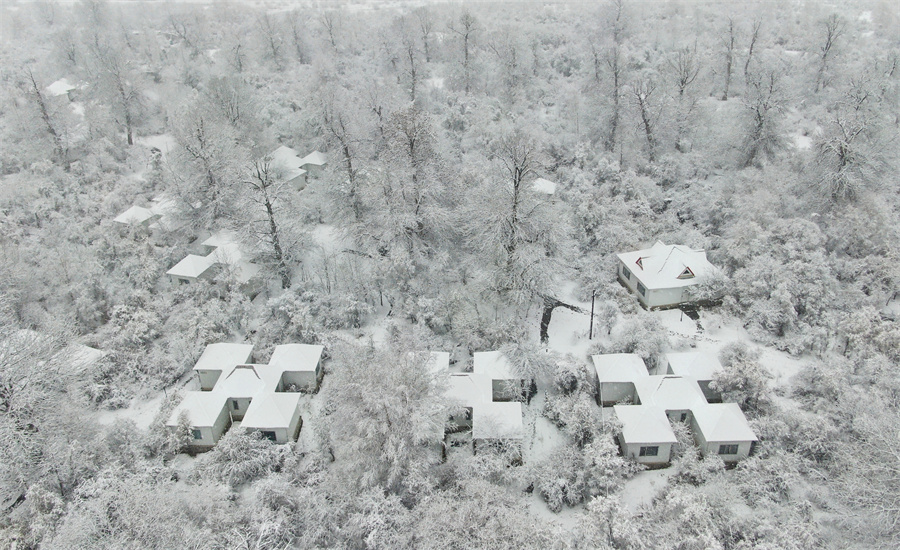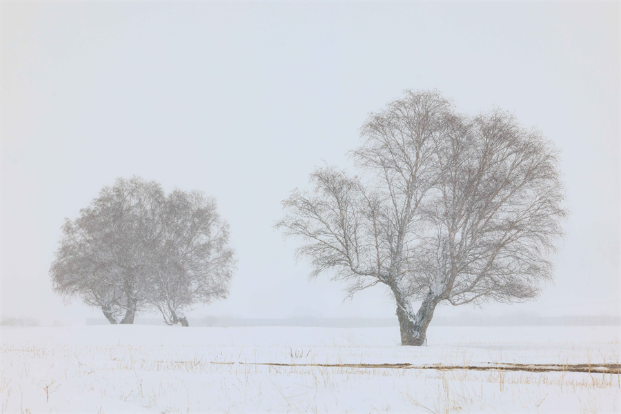 河流在雪原中如墨带蜿蜒穿梭,飞鸟静立雪枝,沙棘树的橙红果实缀于琼枝间,与白雪相映。冬雪轻拢万物,将草原的辽阔、森林的深邃、牧群的悠然编织成一幅静谧却不失生机的立冬图景,每一处景致都流淌着“塞外江南”的冬日诗意。