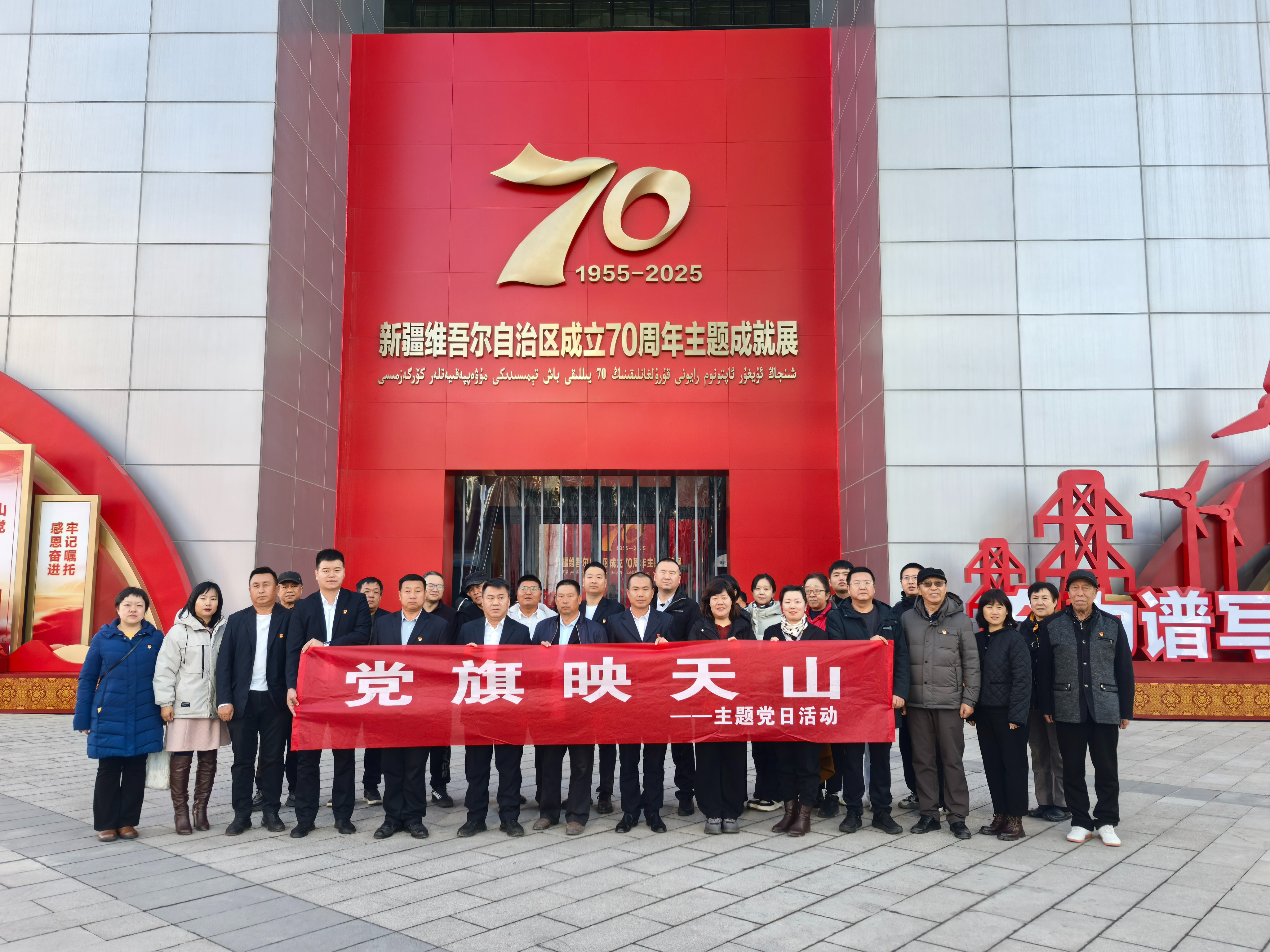 全体党员首先在“1955-2025”金色标识与红色主题展区前整齐列队,手持“旗映天山”主题横幅合影留念,记录下对新疆70年辉煌成就的由衷礼赞。随后,大家在展馆外繁花似锦的景观前再次合影,表达对新疆美好未来的深切期许。