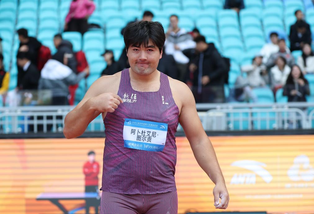 11月20日,新疆队选手阿卜杜艾尼·图尔贡在试投后庆祝。他以64米40的成绩夺得冠军。新华社记者 江汉 摄