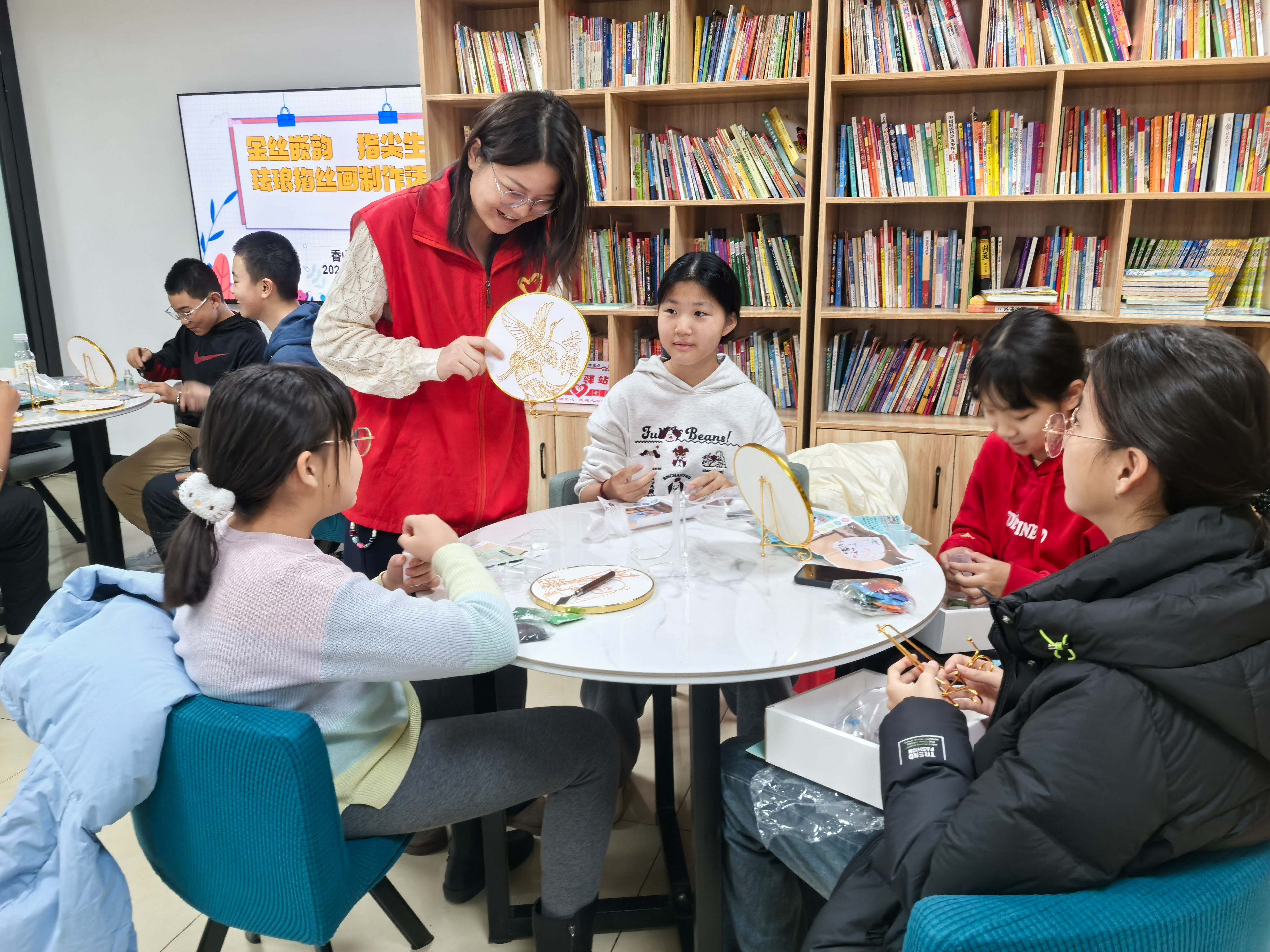 活动当日,所有报名的青少年准时到场,在志愿者的引导下,活动依次分为讲解示范、亲手体验和交流展示三个环节。志愿者首先简要介绍了掐丝画的历史渊源、艺术特色与工艺流程,激发了大家的兴趣。随后,志愿者重点演示了调色、填砂与上色的步骤,并展开一对一指导。青少年们全神贯注地学习如何细心调色、填砂,一丝不苟地为图案上色。过程中,大家相互协助,积极交流手法,遇到疑惑主动请教,现场洋溢着专注思考、共同探索的融洽氛围。