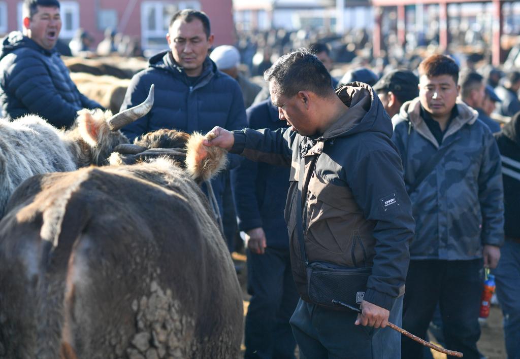 马军在新疆创锦黄公农产品交易市场为客户挑选牛(12月3日摄)。新华社记者 胡虎虎 摄