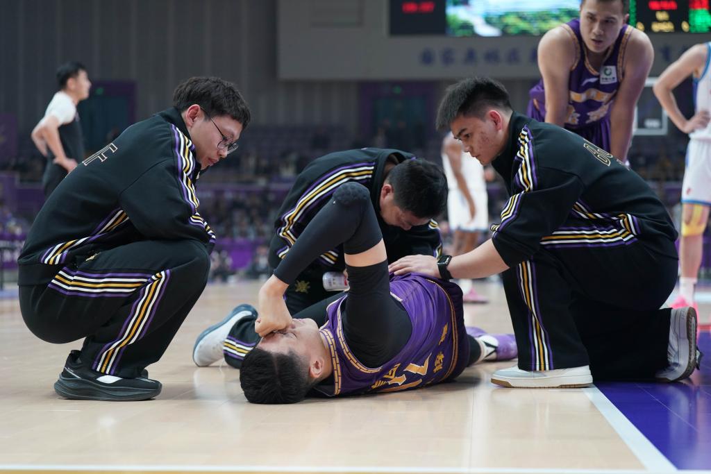 12月18日,北京控股队球员沈梓捷(中下)在比赛中受伤倒地。新华社记者 谢晗 摄