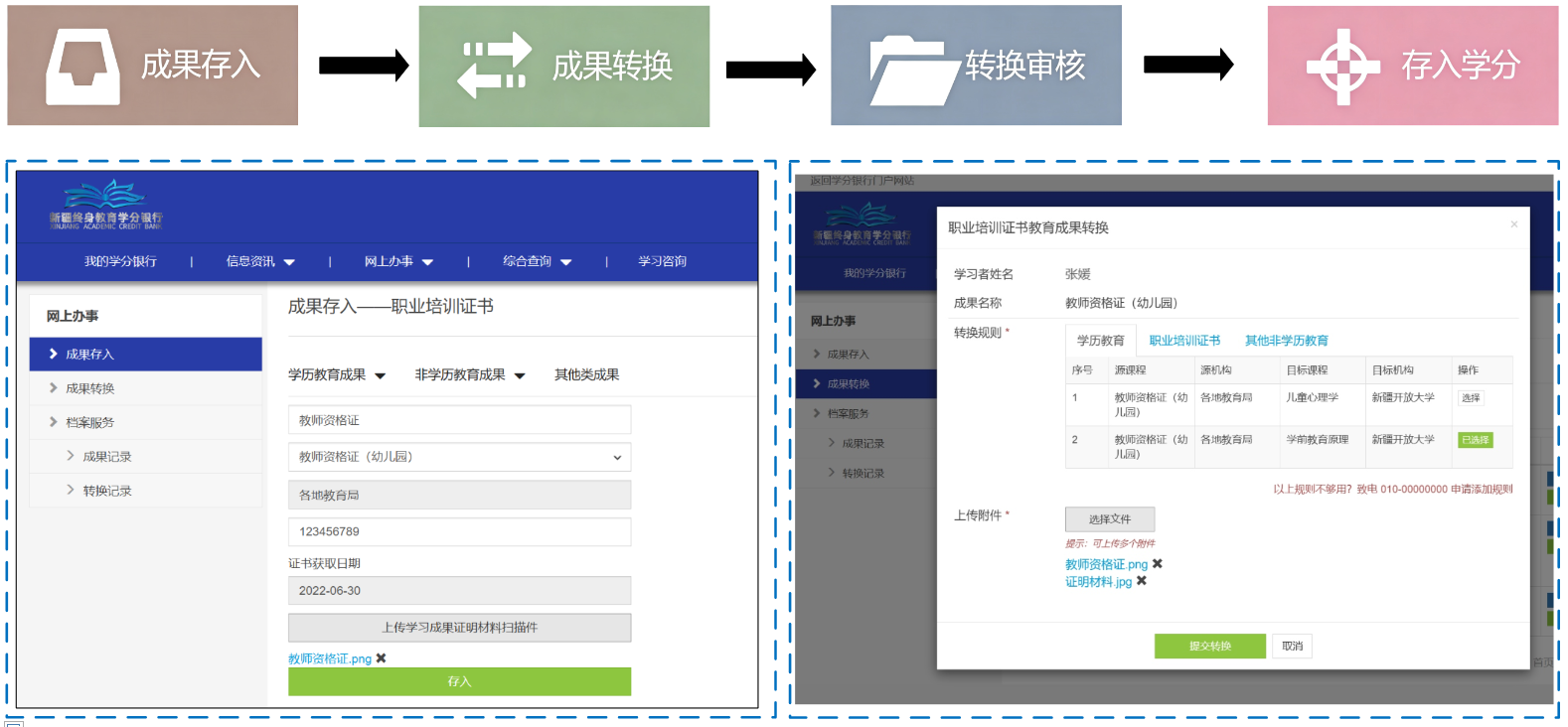 学习成果转换工作依托新疆终身教育学分银行开展。新疆终身教育学分银行是面向全体学习者的终身学习公共服务平台,提供学习成果认证、存储与学分转换等服务,并通过统一标准和流程,实现不同类型学习成果规范管理与互认互通,为学习者终身学习提供支撑。