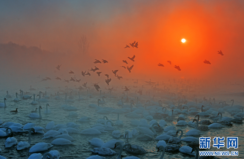 大寒以来,新疆伊宁县天鹅泉连续多日雾凇凝霜、雾气氤氲,远山皑皑白雪映着金色朝霞,成群疣鼻天鹅、大天鹅翩跹起舞,构成一幅梦幻般的冬日画卷。