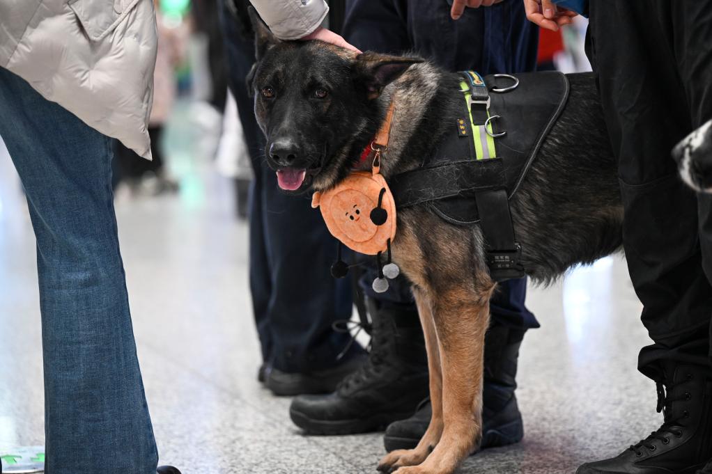 1月30日,在乌鲁木齐铁路公安处举办的“新疆铁警‘警馕’妙计 助您平安回家”安全出行宣传活动中,旅客与警犬互动。