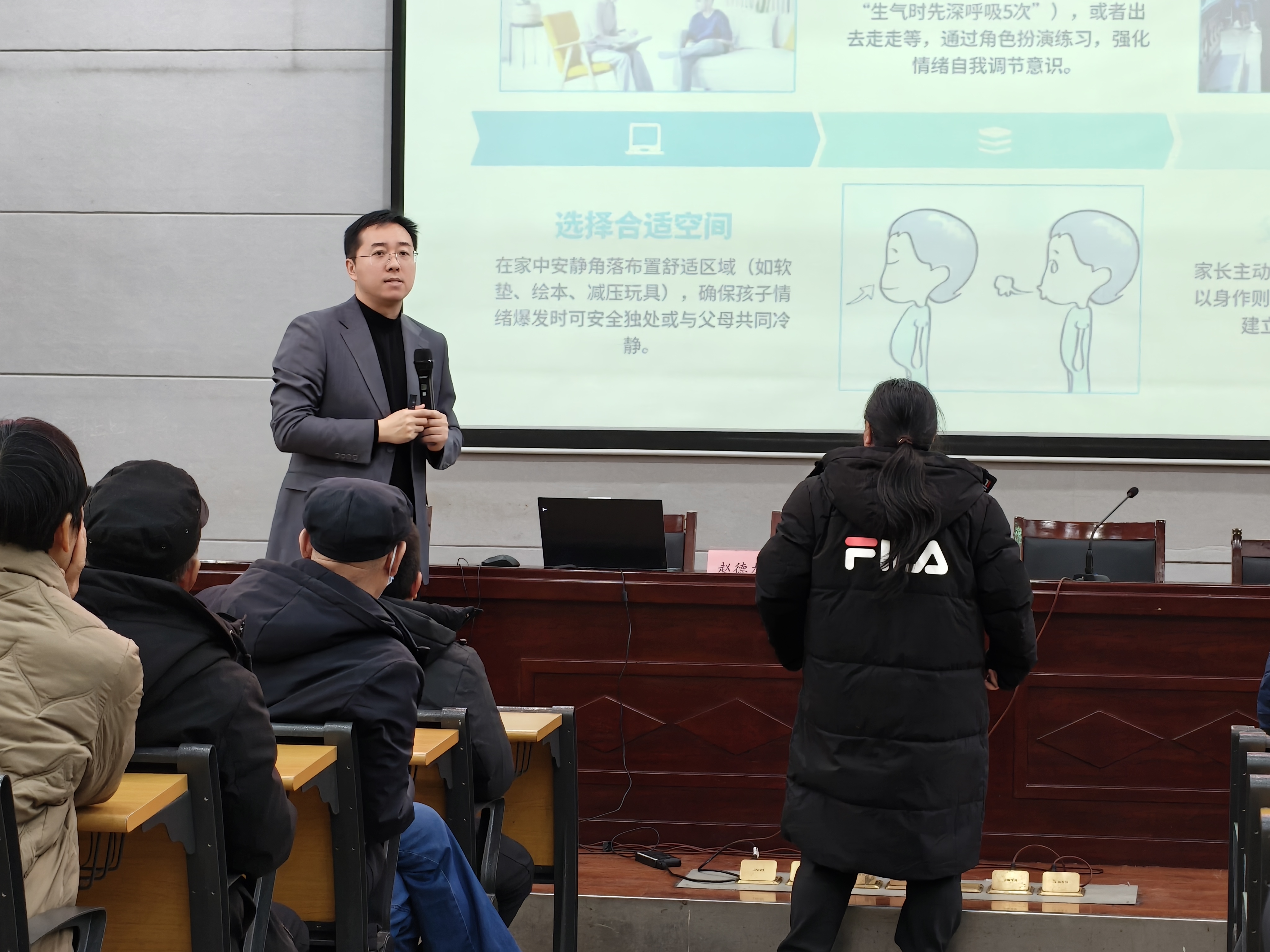 在互动交流环节,家长们结合自身在亲子沟通、孩子情绪引导、学习习惯培养等方面遇到的困难现场提问。赵德龙老师运用专业的心理学知识为家长们答疑解惑,并提出了针对性强的指导建议,现场掌声不断。学生家长杨雪琼说:“今天的讲座内容干货满满、贴合实际。我们家孩子写作业特别拖沓,今天赵老师现场给我们进行了一对一解答,让我明白了家长在平日引导上存在的问题,让我们掌握了科学教育方法,收获很大。”